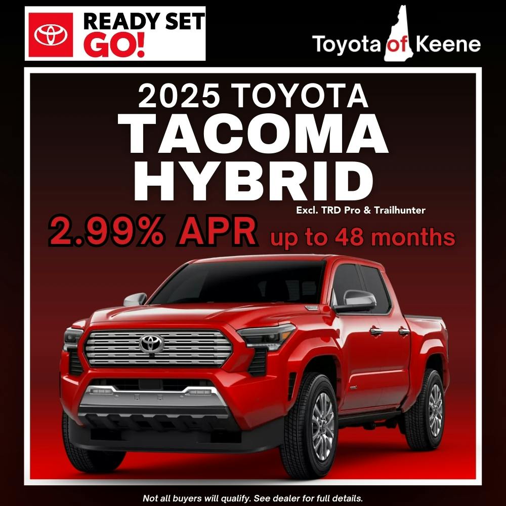 Get APR financing as low as 2.99% on a new 2025 Tacoma Hybrid. Excluding TRD Pro & Trailhunter.