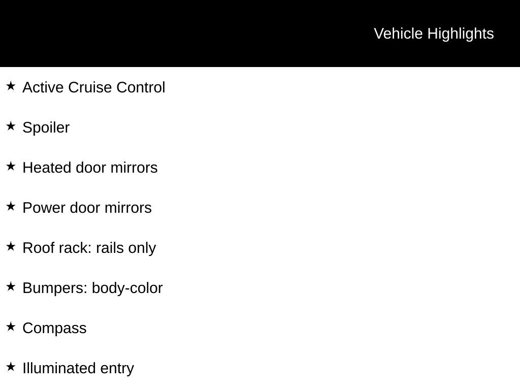 ABS brakes, Active Cruise Control, Alloy wheels, Bumpers: body-color, Compass, Electronic Stability Control, Front dual zone A/C, Heated door mirrors, Heated Front Bucket Seats, Heated front seats, Illuminated entry, Leather Seat Material, Low tire pressure warning, Power door mirrors, Power Liftgate, Power moonroof, Remote keyless entry, Roof rack: rails only, Spoiler, Traction control.