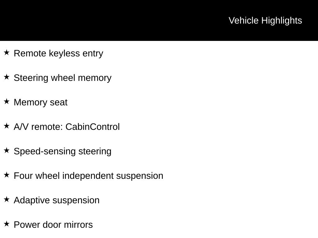 - Driver seat power reclining, lumbar support, cushion extension, seatback side bolster support, cushion tilt, fore/aft control and height adjustable control