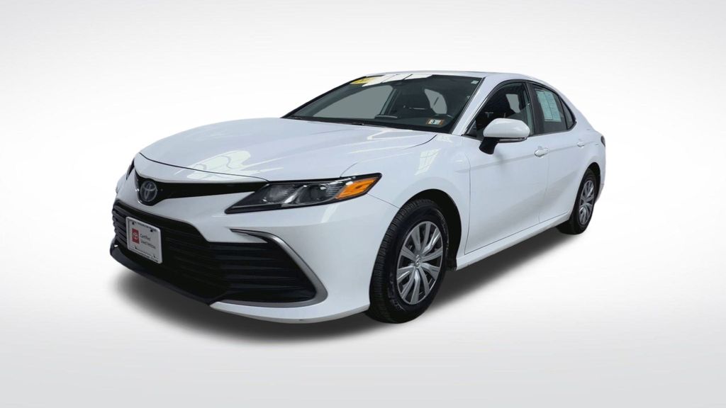 Certified. White 2023 Toyota Camry Hybrid LE 4D Sedan FWD eCVT 2.5L I4 DOHC 16V 51/53 City/Highway MPG